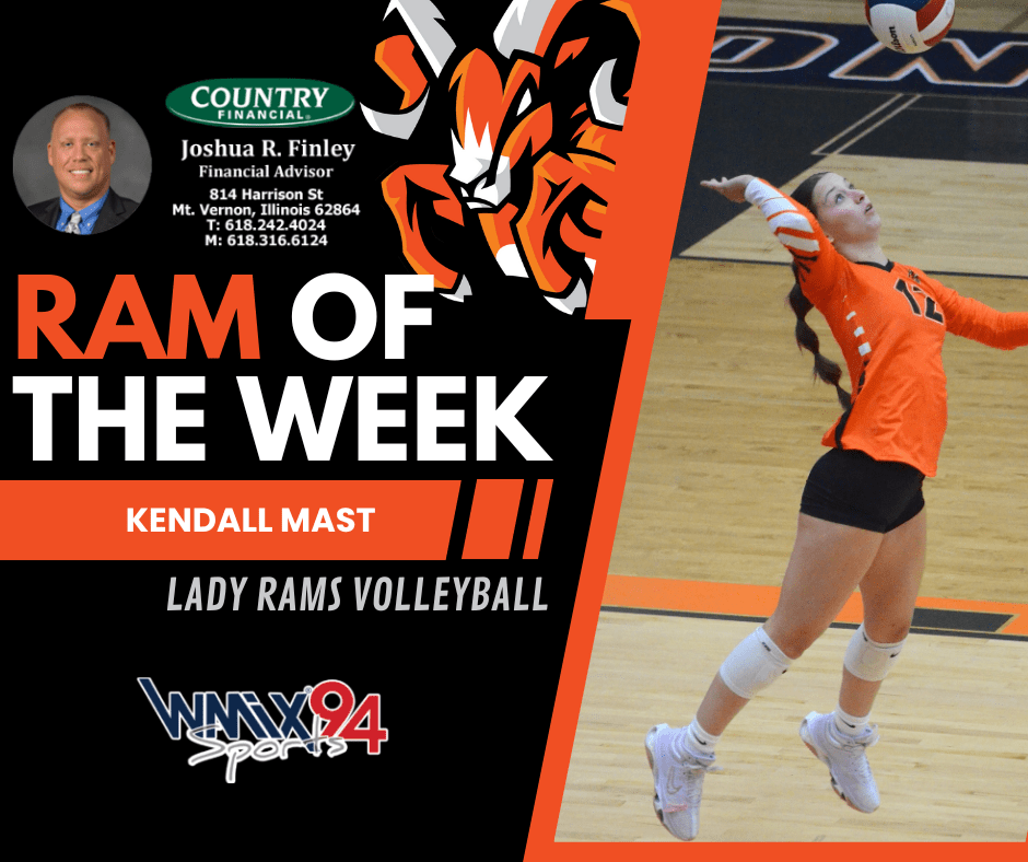 Sophomore Kendall Mast has been named this week’s Josh Finley Country Financial Ram of the Week after helping lead Lady Rams Volleyball to a decisive 25-12, 25-4 win over Cahokia in South Seven Conference play on Wednesday, September 24.
