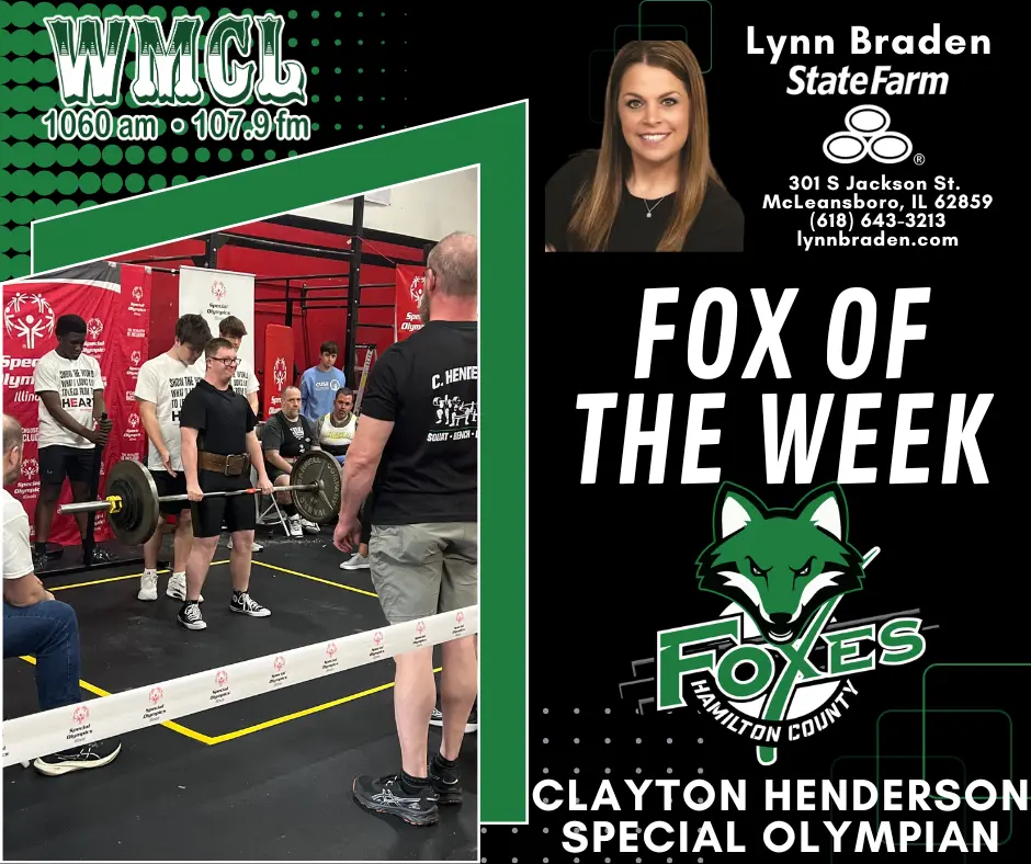 The Lynn Braden State Farm / WMCL Fox of the Week honors a remarkable achievement this week, as Clayton Henderson brought home four gold medals at the Special Olympics Illinois Weightlifting Event in Bloomington on Sunday, March 22.